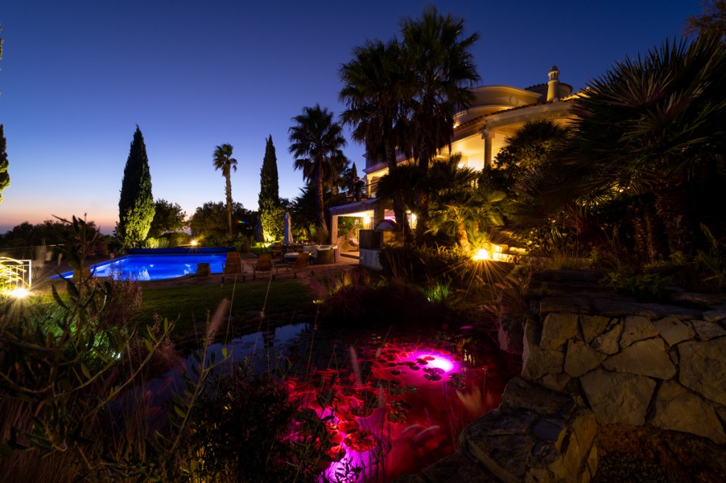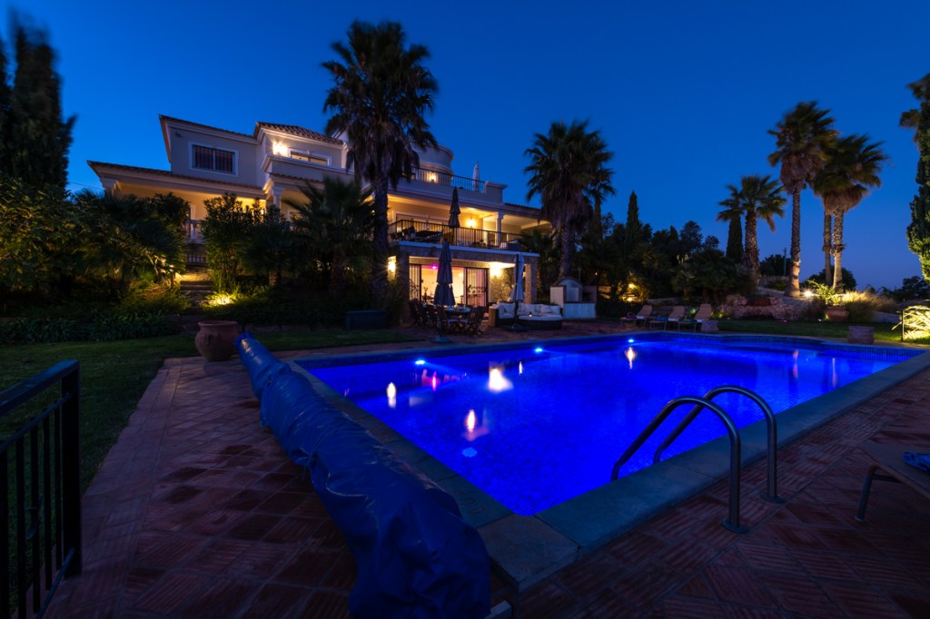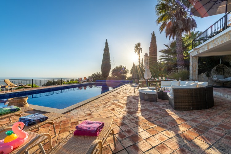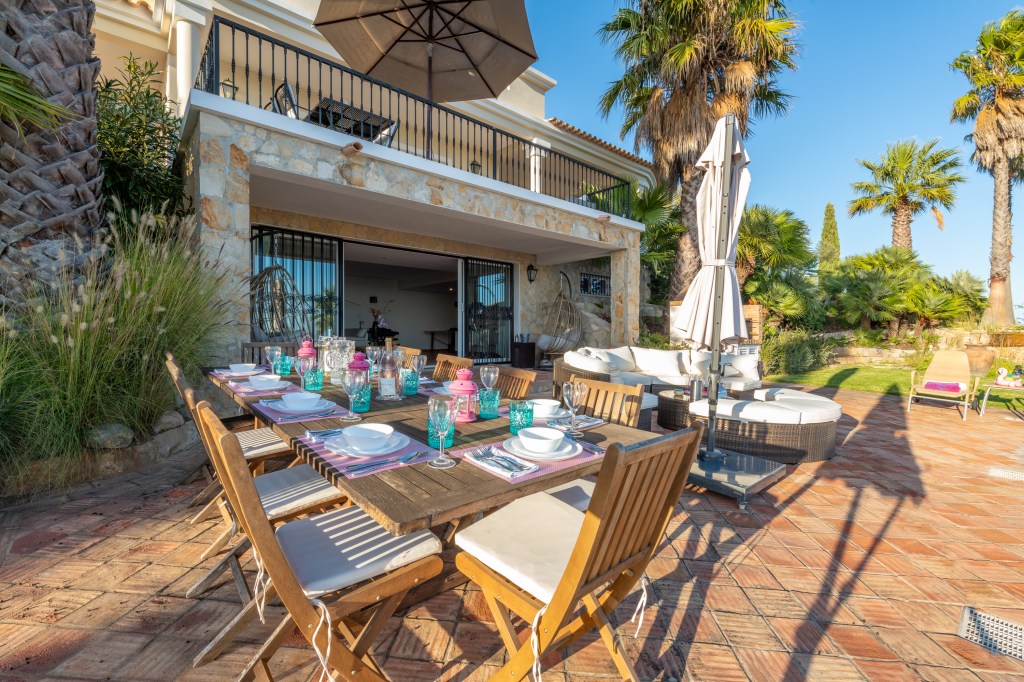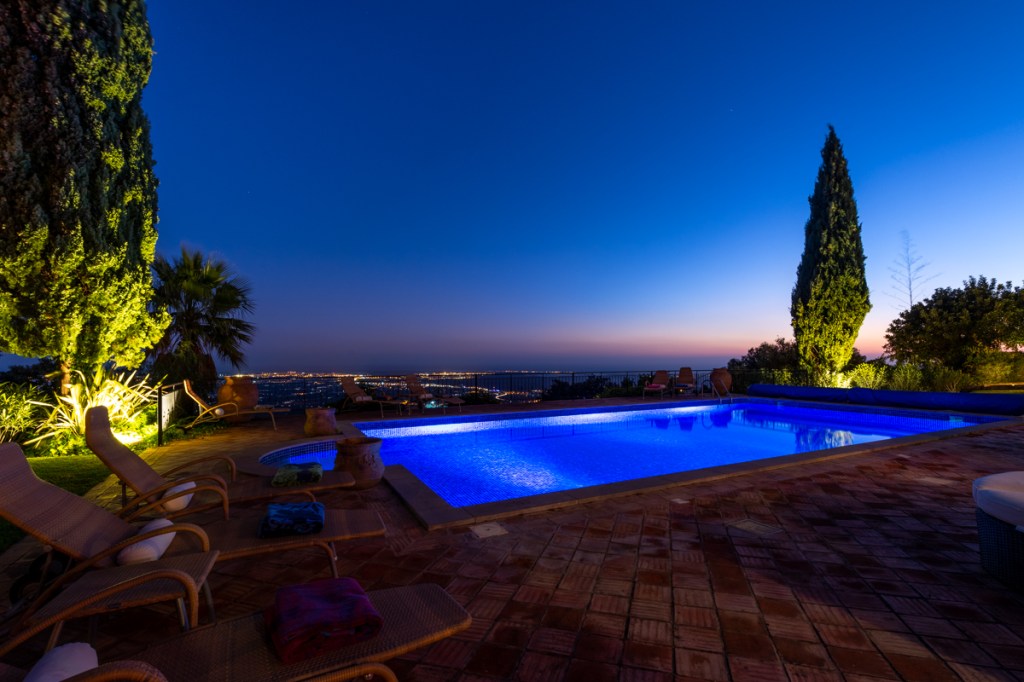 Boasting panoramic Atlantic views on a 5 Acre Setting, the villa is a magnificent 5 bedroom property with a large heated salt swimming pool, games room, mature gardens with fish ponds and near 360° panoramic views over the Algarve and Atlantic Ocean. Once home to one of the world’s most famous football players, this al fresco lifestyle will be yours. The villa can accommodate 12 and is set in a private, quiet location. Located in the Golden Triangle, near the town of Loule, the villa is less than 20 minutes from Faro airport, 30 minutes to the beaches of Quinta do Lago, and 8 minutes to the new Mar shopping center.