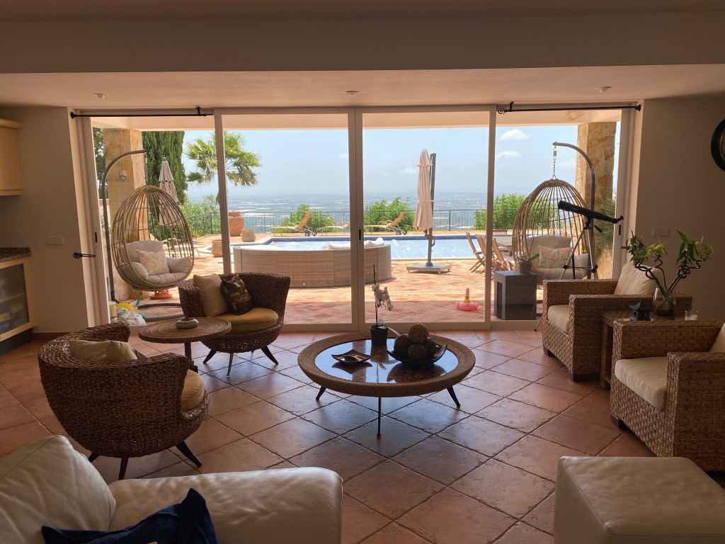 The delightfully large 12×6 meter salt pool is Ph balanced and 210cm at its deepest point. There are 8 sun loungers, a large semi-circular sofa, which seats 10 adults, 2 swinging egg chairs, 2 large umbrellas, a shaded dining area by the BBQ, and an assortment of pool toys and floats.