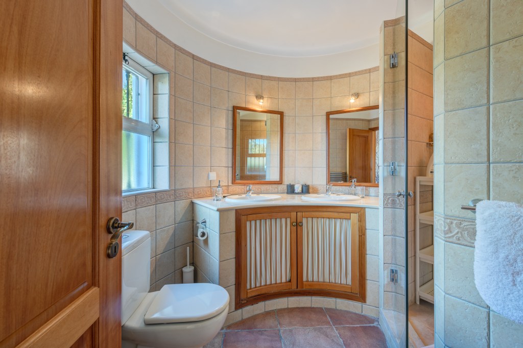 The Master bedroom is found on the upper level. It has an en suite with both a shower stall and large Jacuzzi bath, mounted flat screen TV, and separate dressing and sitting areas. Sliding glass doors lead onto the upper terrace. The second ensuite bedroom is also on this level. It has a sitting area and shares the private upper terrace with the master bedroom.